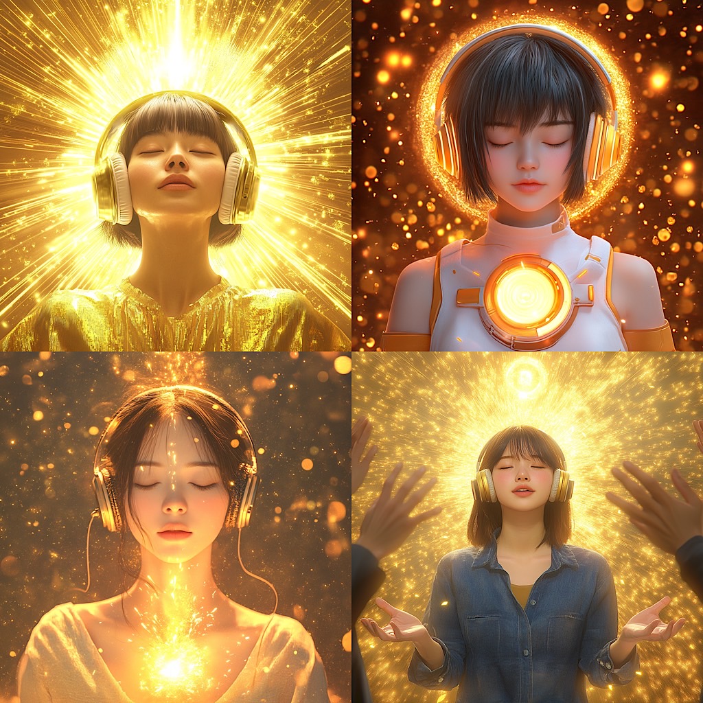 photorealistic, beautiful asian women, black hair, 4k, highly detailed, Full-body shot , A square (1:1 aspect ratio) digital illustration featuring a young woman with a serene, uplifted expression, eyes closed, and head tilted slightly upwards. She is wearing modern headphones that emit a soft, golden glow. Her short, light brown hair also shows subtle golden highlights. The central focus is a bright, radiant light emanating from her chest and extending upwards, connecting to a glowing, abstract symbol (resembling the top part of the previous images, now in a golden outline) above her head. Her arms are outstretched, palms open, in a gesture of reception or embrace. The entire scene is dominated by a rich, warm golden background, filled with shimmering golden particles and subtle golden light rays that create a vibrant and ethereal atmosphere. The overall mood is one of peace, joy, and spiritual connection, rendered in a luminous, contemporary art style with a strong emphasis on radiant golden light