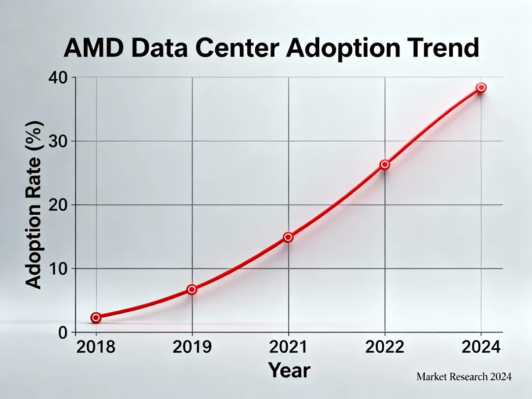 위 그래프를 보면 2018년 약 2% 수준이던 AMD의 데이터센터 채택률이 2024년에는 38% 근처까지 급등한 걸 알 수 있어요.
