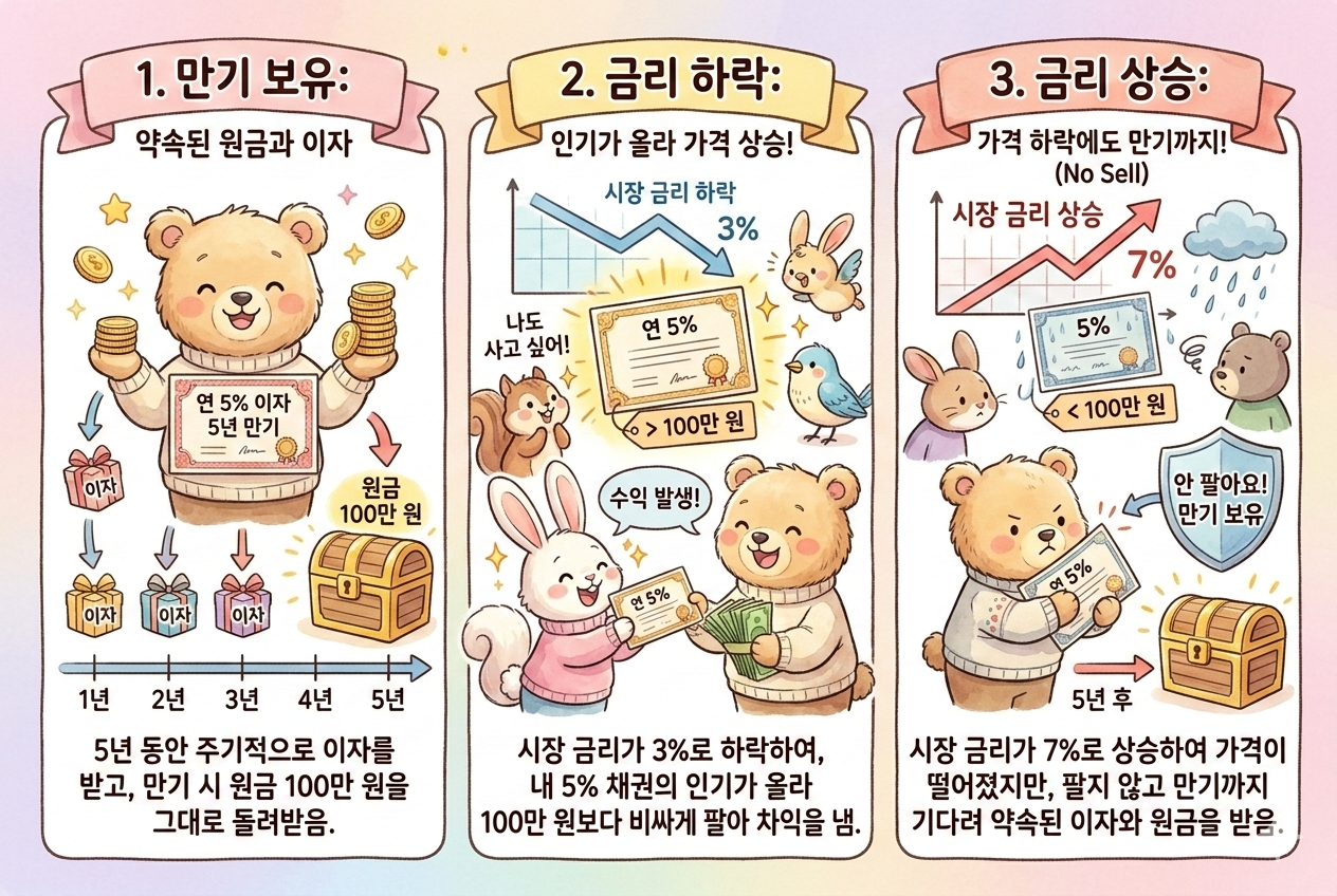• 채권의 반응: 금리가 낮아지면 새로 나오는 채권들의 이자가 형편없어집니다. 그럼 예전에 만들어둔 '높은 이자'의 채권들이 귀한 몸이 되어 가격이 치솟습니다.