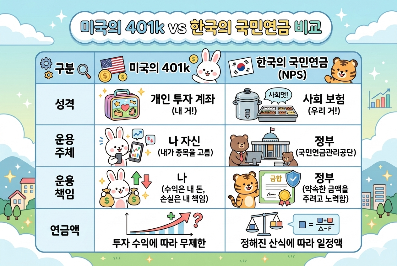 월급에서 일정 비율을 떼고, 회사도 똑같은 금액을 보태주는 '50:50 매칭' 구조만 보면 우리나라의 국민연금과 정말 비슷해 보이죠? 하지만 이 둘은 "누가 이 돈을 굴리고, 그 결과에 누가 책임을 지느냐"에서 완전히 갈립니다.