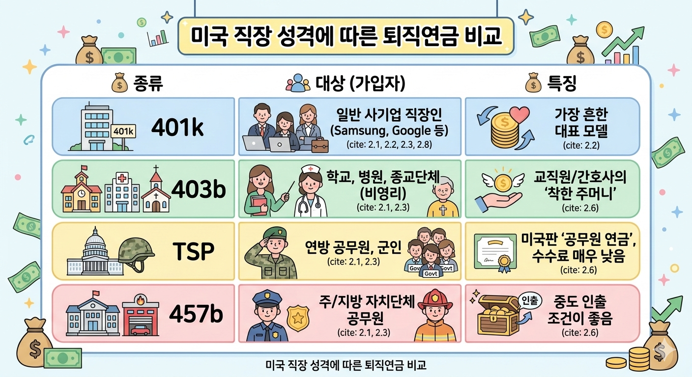 미국에서는 내가 어떤 직업을 가졌느냐에 따라 차고 다니는 '연금 주머니'의 이름이 달라집니다. 하지만 어떤 주머니를 찼든 그 안의 핵심 원리는 똑같아요. 바로 "젊을 때 미리 주식을 사서 노후를 든든하게 준비한다"는 것이죠.